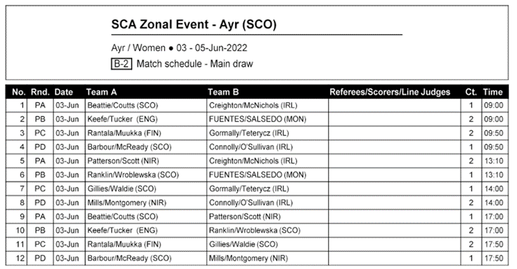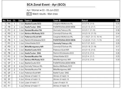 Ellen & Lara get the tournament underway with a massive test against the top seeds Lynne Beattie and Mel Coutts, whilst Laura and Amy take on Scotland’s number 2 team of Barbour & Morrison. Miriam and Kama entertain the highly fancied Finland.